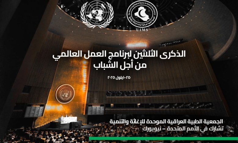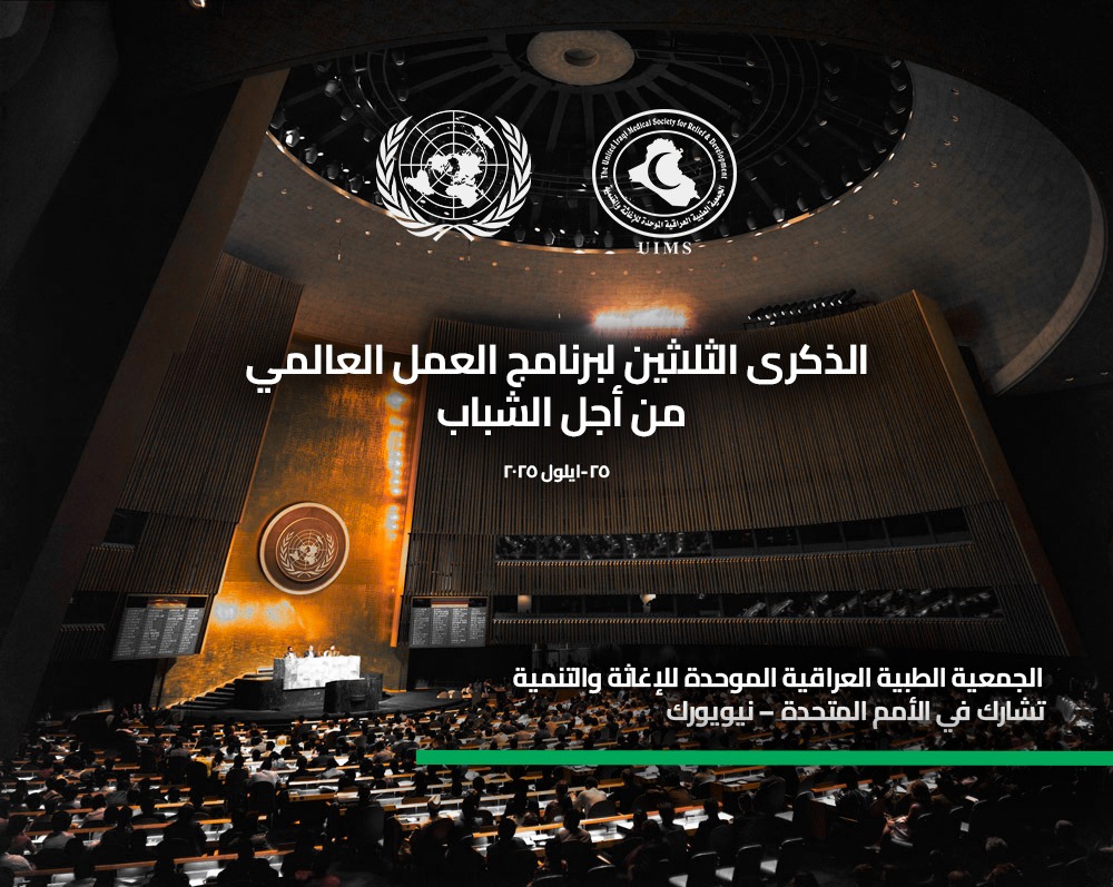 تشارك الجمعية الطبية العراقية الموحّدة للإغاثة والتنمية (UIMS) في الاجتماع رفيع المستوى للجمعية العامة للأمم المتحدة بمناسبة الذكرى الثلاثين لبرنامج العمل العالمي من أجل الشباب، والذي سيُعقد بتاريخ 25 أيلول 2025 في مقر الأمم المتحدة – نيويورك، بحضور قادة عالميين ومنظمات دولية بارزة.