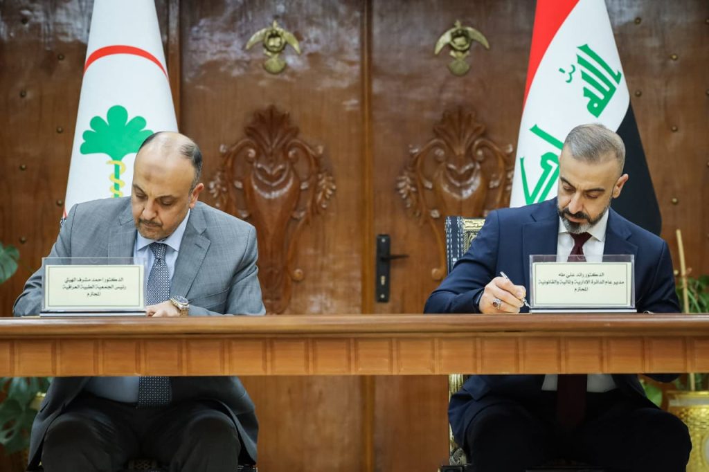 The agreement was signed in the presence of the Administrative Deputy Minister of Health, Dr. Khamees Al-Saad, representing the Minister. The Ministry was represented in the signing by Dr. Raed Ali Taha, Director General of the Administrative, Financial and Legal Department, while the agreement was signed on behalf of UIMS by Dr. Ahmed Mushrif Al-Heeti, President of the Society, in the presence of Dr. Wissam Al-Tamimi, Director of the International Health Department, along with a number of Ministry officials and members of the Society’s delegation.